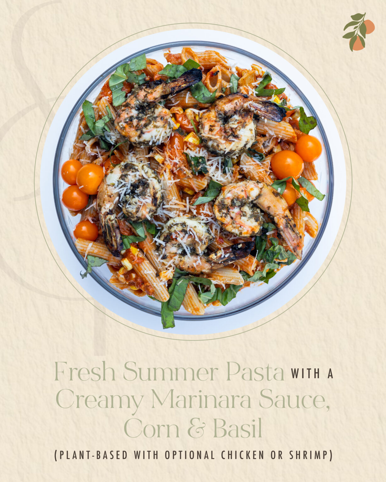 I love creating recipes that bring everyone to the table — whether they’re fully plant-based or enjoy adding a little protein to their meal. This fresh vegan pasta recipe with creamy marinara sauce, cherry tomatoes, corn, and basil is my favorite to capture the best end of summer season ingredients. Add chicken or shrimp for a flexible, healthy dinner that satisfies both plant-based eaters and meat lovers. This fresh, vibrant pasta is one of those dishes that makes it easy to please everyone. I cook the chicken or shrimp separately and add them to the pasta at the end. It’s the perfect way to keep the dish flexible without making multiple meals.